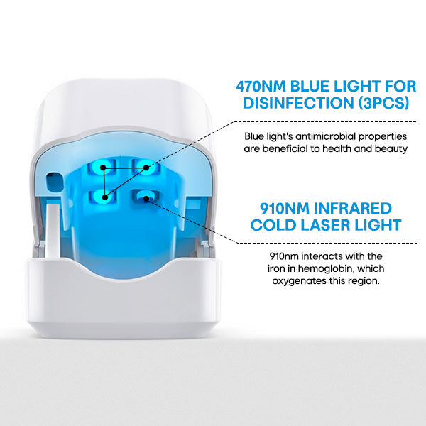 Seurich™ AdvanceLight FootFix Device utilizes blue light therapy with a specific wavelength (470 nm) to treat nails. This form of therapy involves the exposure of nails to blue light, entering the nail's surface layer and triggering a photodynamic response with the keratin. Oxygen molecules and free radicals are generated, leading to the destruction of bacteria and fungi surrounding the nail. Simultaneously, blue light possesses an antibacterial effect, reducing infection and alleviating inflammation, redness, heat, and pain. All of this is provided without the risk of side effects or developing drug resistance.