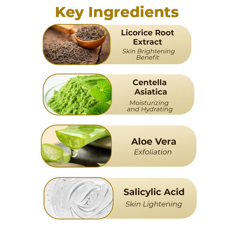 - Licorice Root Extract - Licorice root contains a compound called glabridin, which has been shown to inhibit tyrosinase, an enzyme involved in the production of melanin (the pigment responsible for dark skin). By inhibiting tyrosinase, licorice root may help to reduce the production of melanin, leading to a brighter complexion and a reduction in dark spots or hyperpigmentation.