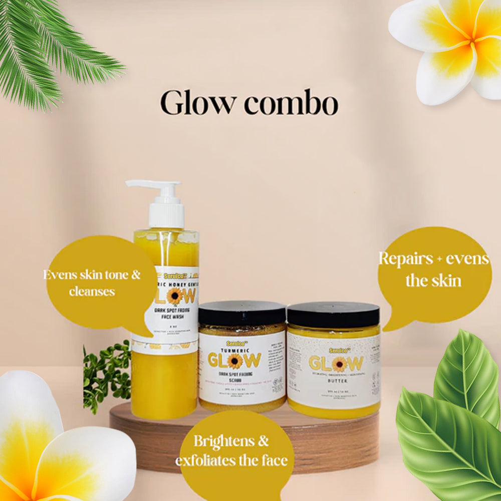 The Glow Combo typically consists of a set of products, including a cleanser, a serum, and a moisturizer. These products work together to cleanse, nourish, and hydrate your skin, promoting a healthy and glowing complexion.