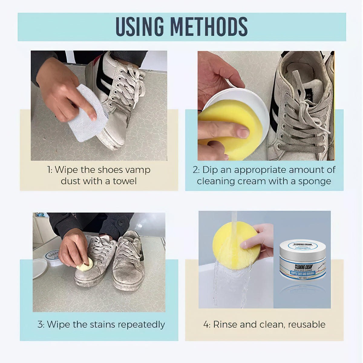 - Gentle, Safe And Durable: The traditional way of brushing shoes is easy to damages the surface of shoes, resulting in peeling, degumming, pilling, and other problems of the upper. Our products are mildly formulated and won't hurt your shoes or hands, turning "black" shoes into "white" shoes in one minute.